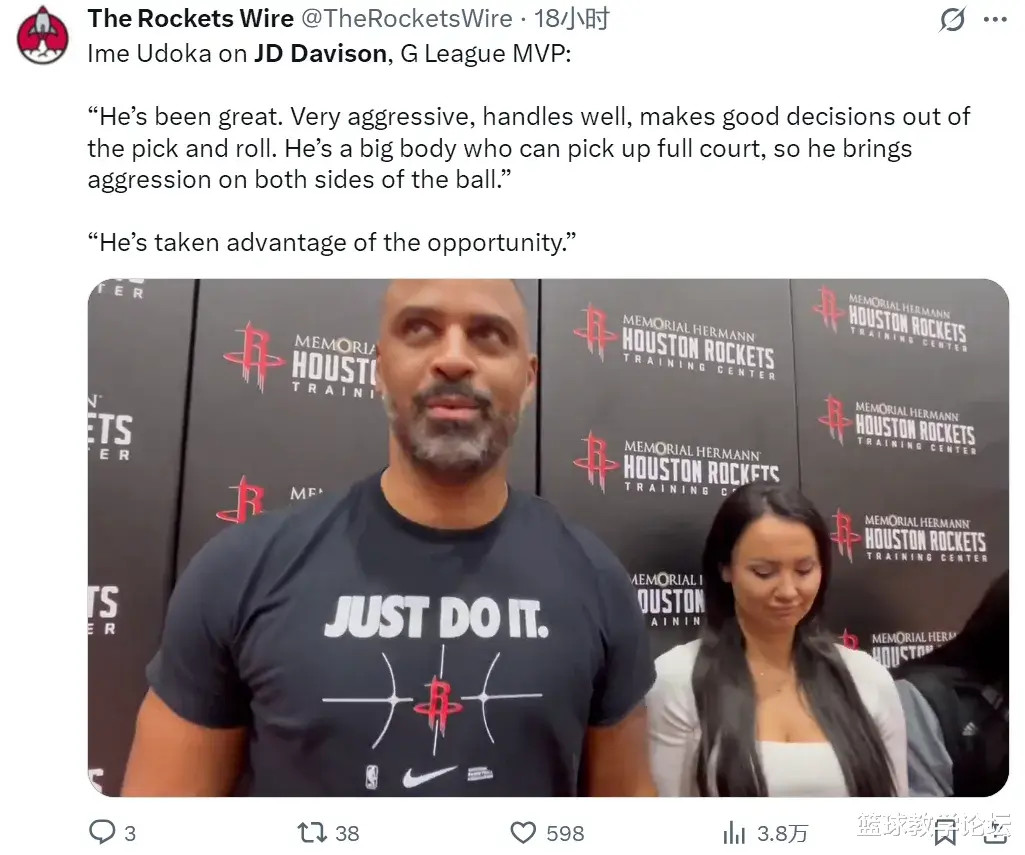 On October 6, Rockets coach Uduka talked about two-way contract player JD Davidson in an interview. Uduka said: "I used to take him when I was coaching at the Celtics. I know Davidson very well! His decisions are wise and can make the right decisions on the court. So far, Davidson has performed very well."