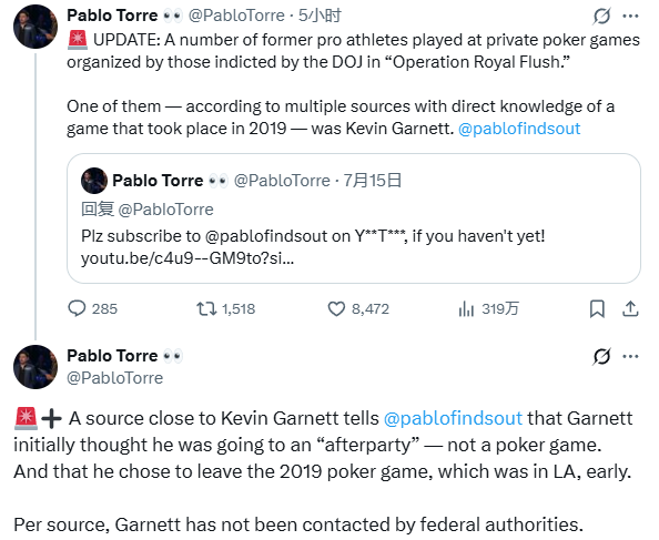 Pablo Torre further reported that a source close to Garnett revealed that Garnett initially thought he was going to an "after-party" instead of playing poker, and he chose to withdraw early from a poker game held in Los Angeles in 2019; the insider revealed that Garnett has not received any contact from federal authorities.