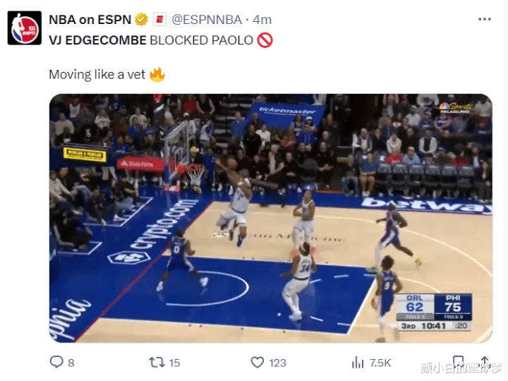 Edgecombe jumped high and blocked Bankero, and the audience cheered. Edgecombe hit two more mid-range shots in the last quarter, but when he saw Maxey's fighting spirit getting stronger, he took the initiative to assist Maxey many times. Maxey lived up to expectations and scored 10 points in a row. Entering the last 50 seconds, Philadelphia pulled away to 10 points to seal the victory.