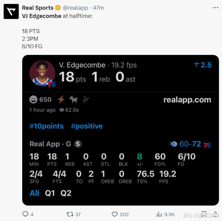 In the third quarter, Edgecombe returned the stage to Maxi. In the first quarter, Big Brother made 3 of 8 + 1 of 0 three-pointers and scored 9 points, 3 assists and 2 rebounds. Maxi had scored 31 points after three quarters. Edgecombe scored 4 points on 2 of 3 in this quarter. After three quarters, Edgecombe had 22 points, 2 rebounds, 1 assist, 1 steal and 1 block. The new backcourt is too powerful.