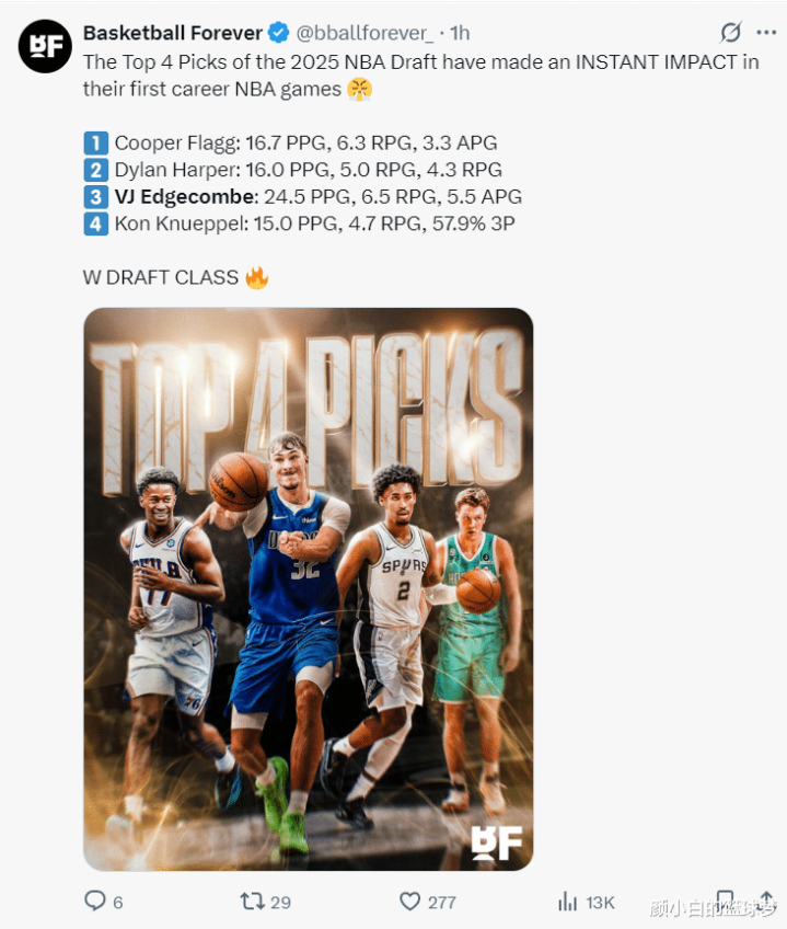 In the first two games of the league, this is the data of super rookies. Edgecombe averaged 24.5 points, 6.5 rebounds and 5.5 assists per game, which is significantly better than the No. 1 pick Vogli and the second pick Harper. Edgecombe, the No. 3 overall pick, has been hailed as Iverson's successor.