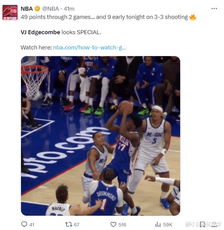 Edgecomb's ability to read the game far exceeds that of a rookie. He hit a European step layup surrounded by three people. In 17 minutes and 40 seconds of the first half, he made 6 of 10 three-pointers and 2 of 4 three-pointers, scoring 18 points, 4 assists and 1 rebound. Maxi had 22 points and 4 assists, Oubre had 16 points and 6 rebounds, leading the Magic by 12 points in the first half without Embiid.