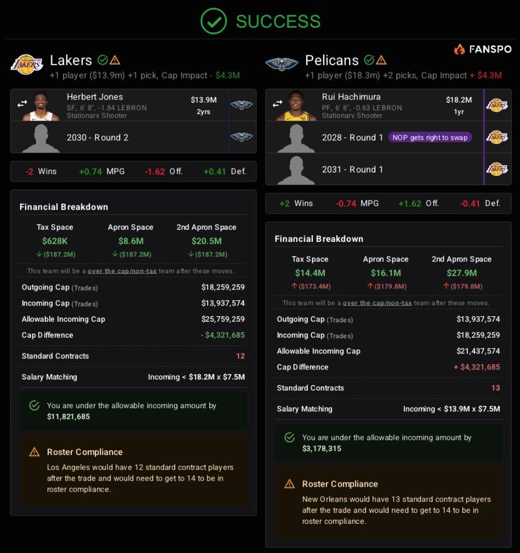 His plan is that the Lakers will give Hachimura Leaf + first round swap rights in 2028 + no first round picks in 2031, and get Jones + second round picks in 2030. This deal is equivalent to getting two first round picks, and the Lakers show their greatest sincerity. In this way, Jones can play the starting third position, and the best defense starters Smart, Doncic, Jones, James, and Ayton.