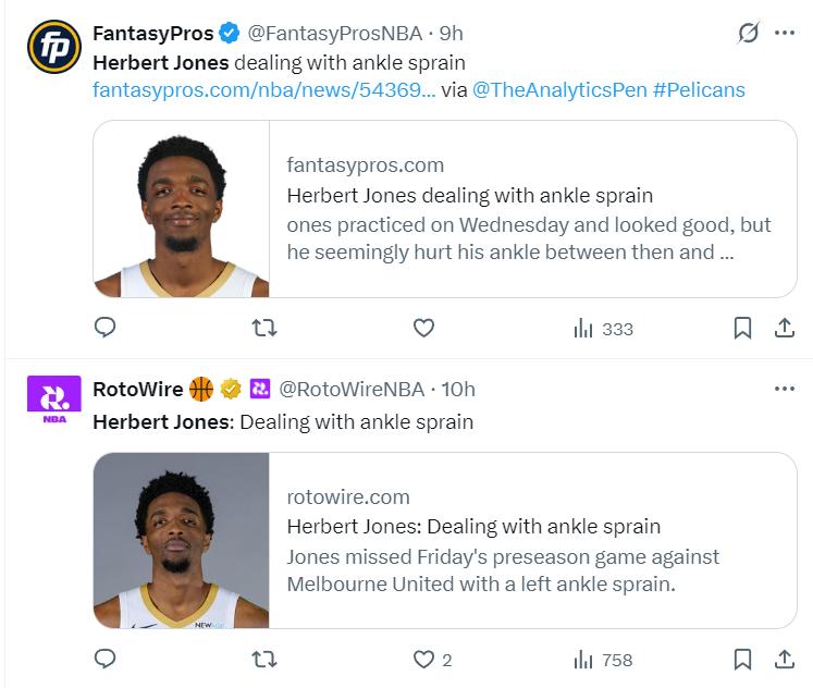In fact, a few hours ago, Herbert Jones was just exposed to be dealing with an ankle injury again. [This summer, Jones just reached a three-year, 68 million early contract renewal with the Pelicans. This contract will bring the total value of Jones' contract with the Pelicans to $97 million in five years and includes player options for the 2029-30 season]