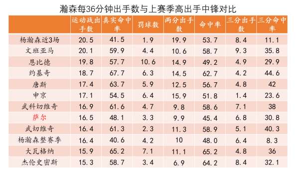 In addition, Yang Hansen has taken 20.5 shots per 36 minutes in the past three sports games. This data even ranked first among all centers last season. It reflects that Yang Hansen has a very strong personal offensive desire, which is a very good thing in the jungle of the jungle. Although the shooting rate is still unsatisfactory, from the table above, the first-year Sarr is also a high-yield and low-efficiency player. His two-point shooting rate in the first season was only 45.4%. The same is true for Hexion. It is obviously impossible to expect him to make a positive contribution in his rookie season, but the key is to practice more and show his skills on the court. If there is no chance in the NBA, go to the Development League to train more. If you recall the Blazers and have the opportunity to play, you will be ready at all times and your progress will be very fast.