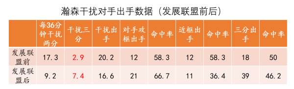 Generally speaking, shooting interference data is related to one's own defensive strategy and the player's own enthusiasm. From the table above, we can see that before playing in the G League, Hexion was mainly defensive on the court, so he interfered with two-point shots a lot. However, after returning from the G League, it is obvious that the number of times he interfered with three-point shots increased significantly. Judging from the impression on the court, he will often go outside to try to block the opponent's three-point shot, which shows that the coaching staff is beginning to try to get Hexion to adopt a defensive switching strategy instead of completely squatting.