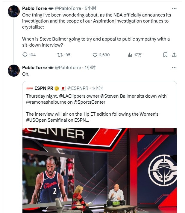 It is worth mentioning that before the show started Pablo Torre tweeted: "With the NBA officially announced the investigation and the scope of our investigation into Aspiration (the company involved), I have been thinking about one thing: When will Ballmer win public sympathy through a face-to-face interview?"