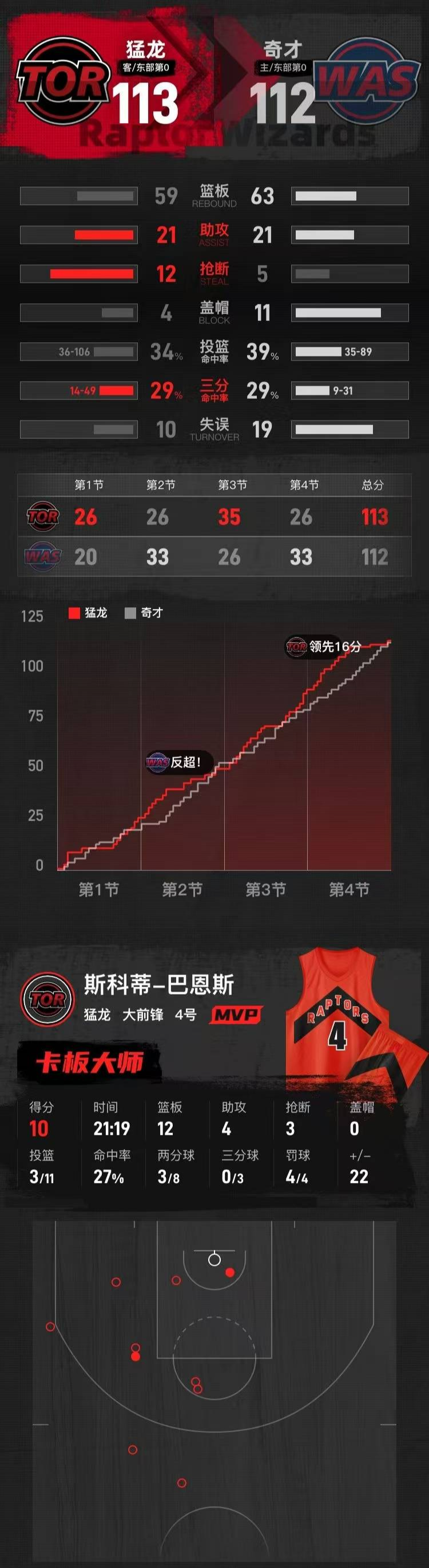At the beginning of the last quarter, the Wizards' status had not improved yet, and the point difference continued to widen, falling behind by as much as 16 points. However, as the game progressed, the Wizards gradually regained their rhythm and once again worked hard to tie the score and once go ahead by 1 point. In the end, Olivier Sarr sent a buzzer-beater, and the Raptors narrowly defeated the Wizards 113-112 and won the game.