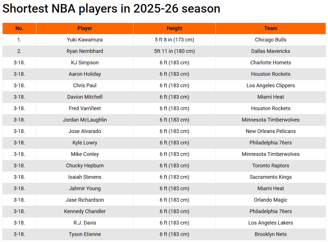 Moon Sports > Basketball > Ranking of the shortest active players in the NBA: Yuki Kawamura leads the list at 173. Paul Van Jordan and 16 others are tied for third place.
