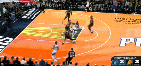 After the Suns grabbed the offensive rebound, Goodwin broke through again. Gillespie and Dunn quickly moved. The former moved to the left at a 45° angle to receive the ball, and the latter cut in, creating an open three-point opportunity.