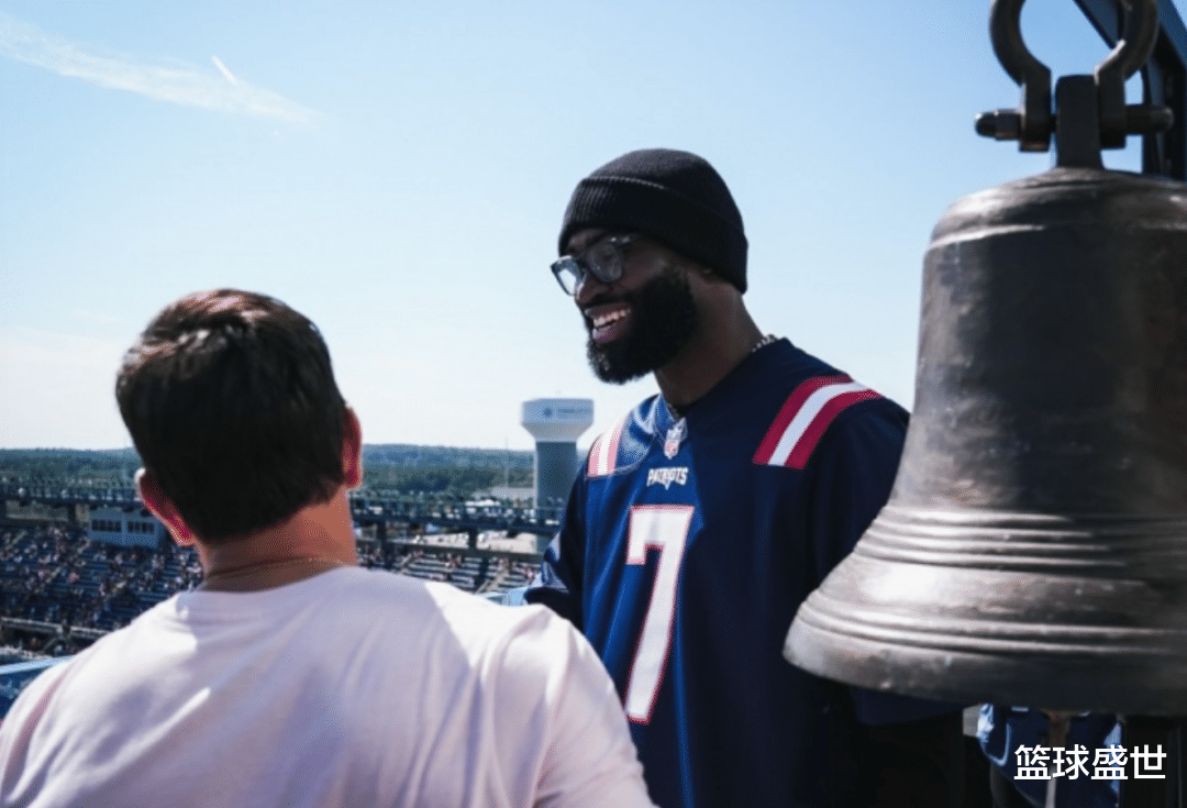 Jaylen Brown is wearing a No. 7 jersey and standing on the sidelines with his teammates on the tower. He wants to ring the kick-off bell for the Patriots' home game; this is the team tradition since 2023.