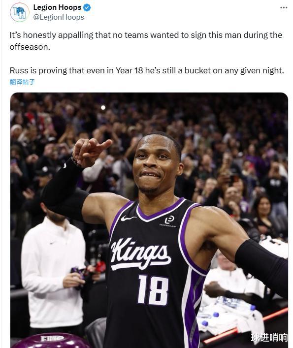 US media Legion Hoops also lamented: "To be honest, it's hard to believe that no one is willing to sign Westbrook during the offseason. This is so shocking. Westbrook has proven with practical actions that even in the 18th season of his career, he can still score on any night."