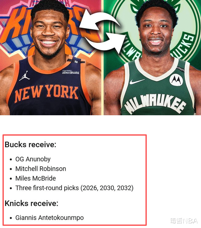 On the other hand, potential trade plans for Antetokounmpo have surfaced. The US media recently revealed the idea of a 1-for-6 trade between the Knicks and the Bucks: the Knicks would send three immediate players, Anunoby, Mitchell Robinson, and McBride, plus three first-round picks, in exchange for Antetokounmpo from the Bucks. From the perspective of chip value, Anunoby is the league's top 3D wing, Mitchell Robinson can strengthen the interior defense, and the three first-round picks can provide key assets for the Bucks' future reconstruction. Such an offer is undoubtedly a very attractive option for the Bucks, who are on the verge of "reconstruction." For the Knicks, after acquiring Antetokounmpo, they will be able to form a championship lineup of "Antetokounmpo + existing core" to further consolidate their status as the top team in the Eastern Conference.