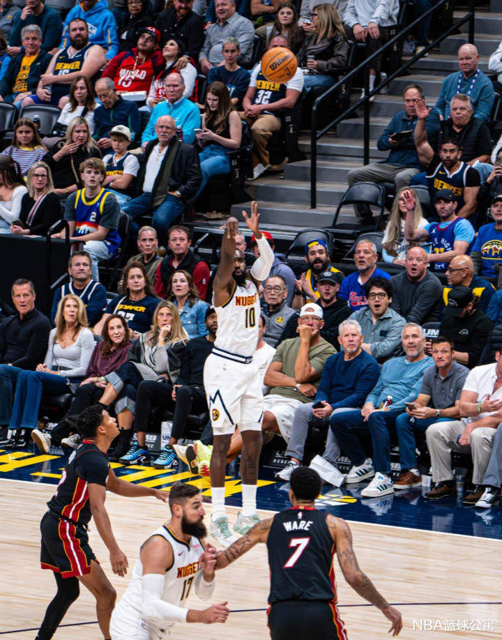 NBA常规赛正在如火如荼的进行中,掘金坐镇主场与热火展开对决。希罗、罗齐尔缺战,迈阿密的首发五虎是阿德巴约、鲍威尔、威金斯、米切尔与拉松,丹佛的首发五人则由约基奇、穆雷、戈登、布劳恩、卡梅隆约翰逊领衔。 The Nuggets are regarded as the favorites to win the championship and are currently committed to hitting the top three in the Western Conference. This game can be said to be a must-win. The two powerful teams staged a fierce confrontation.约基奇与阿德巴约的强力内线对位,是本场比赛的最大看点。