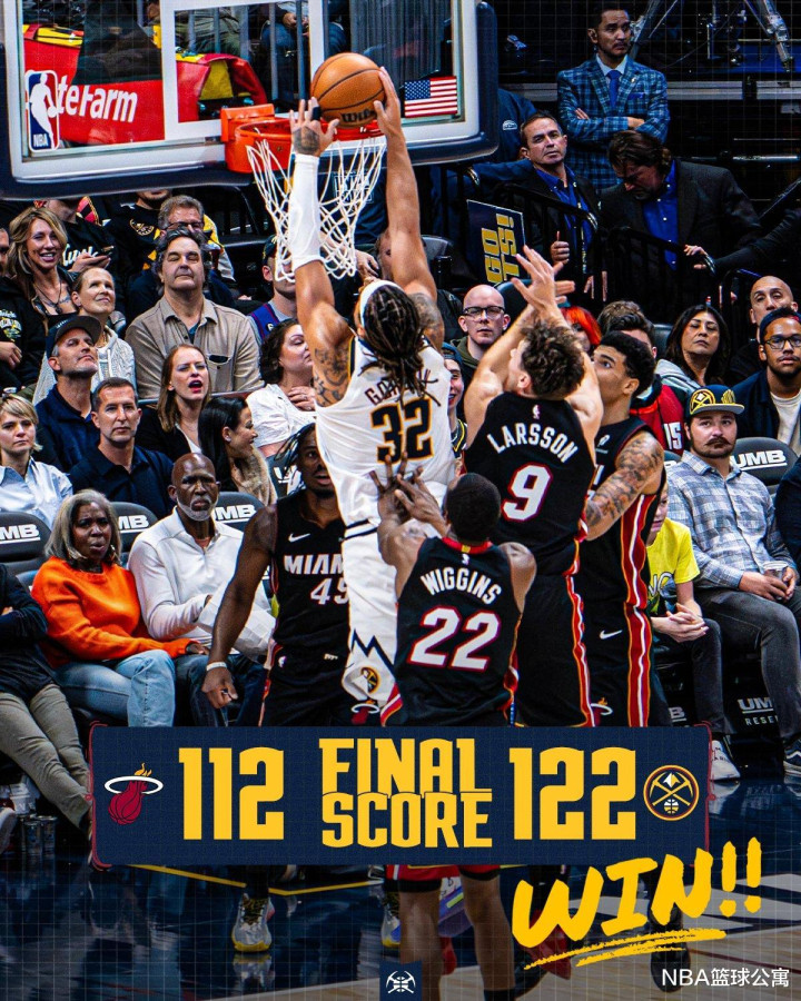 Weir made 2 free throws, Hux scored under the basket, Jokic assisted Hardaway Jr. and hit a three-pointer. Weir scored from the outside, Jokic made 1 of 2 free throws, and then scored with a hook. The Nuggets led by 12 points to seal the game. Hux scored a layup, Powell made two free throws, and Jokic assisted Braun for a dunk. Huskers succeeded in a layup and Murray made 2 free throws. With only 32 seconds left before the end, the Heat fell behind by 10 points and requested a timeout. Powell made a mistake. In the end, the Nuggets defeated the Heat 122-112 and won their second consecutive victory.