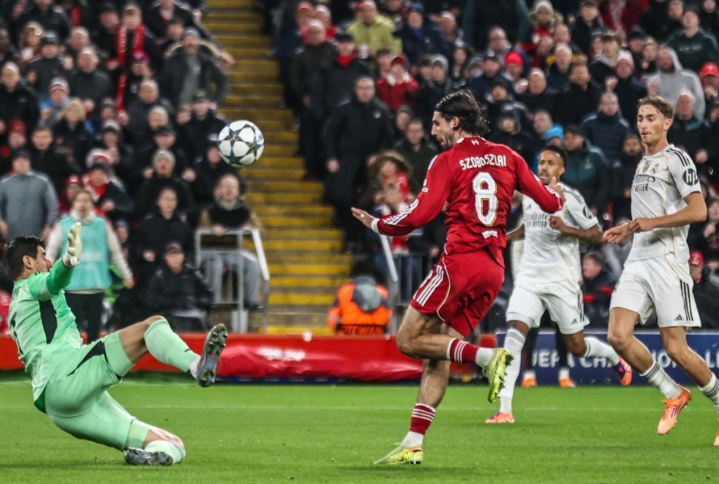 In the 28th minute, Liverpool launched a sharp counterattack. Wirtz sent a cross from the right, and Szoboszlai outflanked the shot, but the ball was blocked by Courtois with his foot. Liverpool wasted its best chance of the first half. Five minutes later, Chuameni had a handball and the referee awarded a free kick. However, with the intervention of VAR, he watched the replay, determined that there was no foul, and canceled the previous penalty. In the 43rd minute, Szoboszlai's long shot was saved. At halftime, the score was still 0-0!