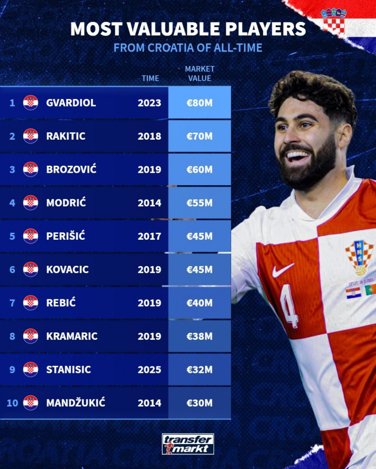 FootballOn October 13, the German transfer market calculated the historical highest value of Croatian players and listed the historical value ranking of Croatian players. Gvardiol topped the list with 80 million euros. List of the highest value Croatian pla...