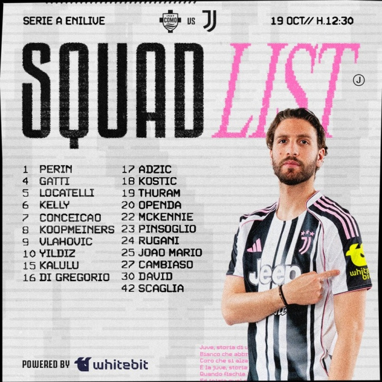 October 19 News At 18:30 on October 19, in the 7th round of the 2025-26 Serie A season, Juventus will play away to Como. Before the game, Juventus officially announced the squad for this game, with Vlahovic leading the striker, Yildiz and David included.