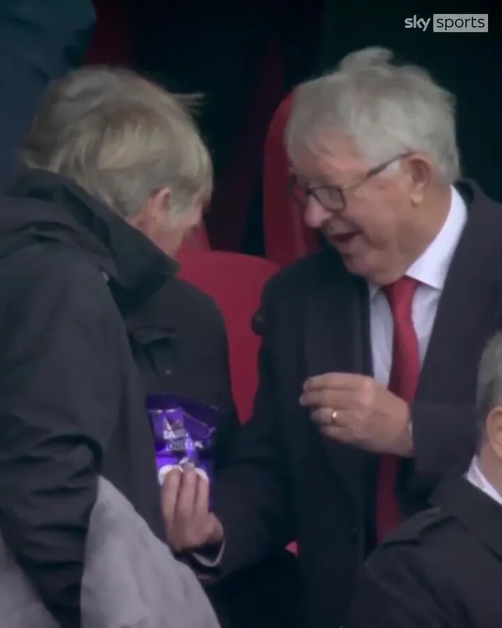 Manchester United ended the first half with a one-goal lead. Ferguson was quite relaxed in the stands and shared his chocolate with Liverpool star Dalglish.