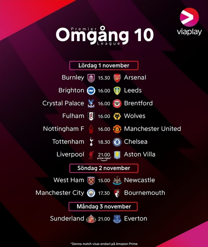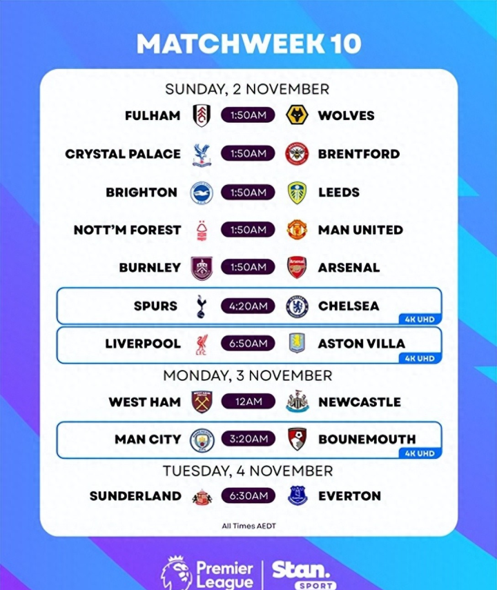 The 10th round of the 25/26 Premier League season will start on the first weekend of November. Due to the midweek EFL Cup match, this round of the Premier League has canceled the Saturday morning and prime-time match arrangements, and instead concentrated the matches more on the 11 o'clock match on Saturday night and later schedules thereafter.