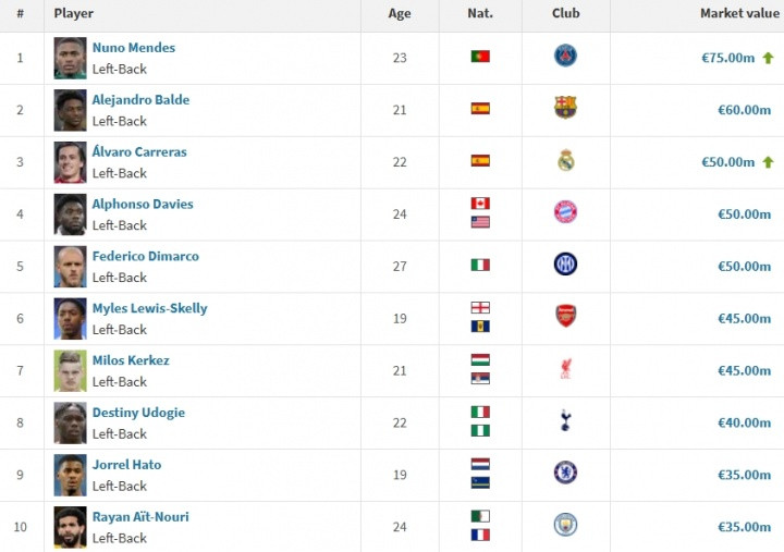The best left back in the world? Left back worth list: Mendes ranks first with 75 million, Balde second with 60 million