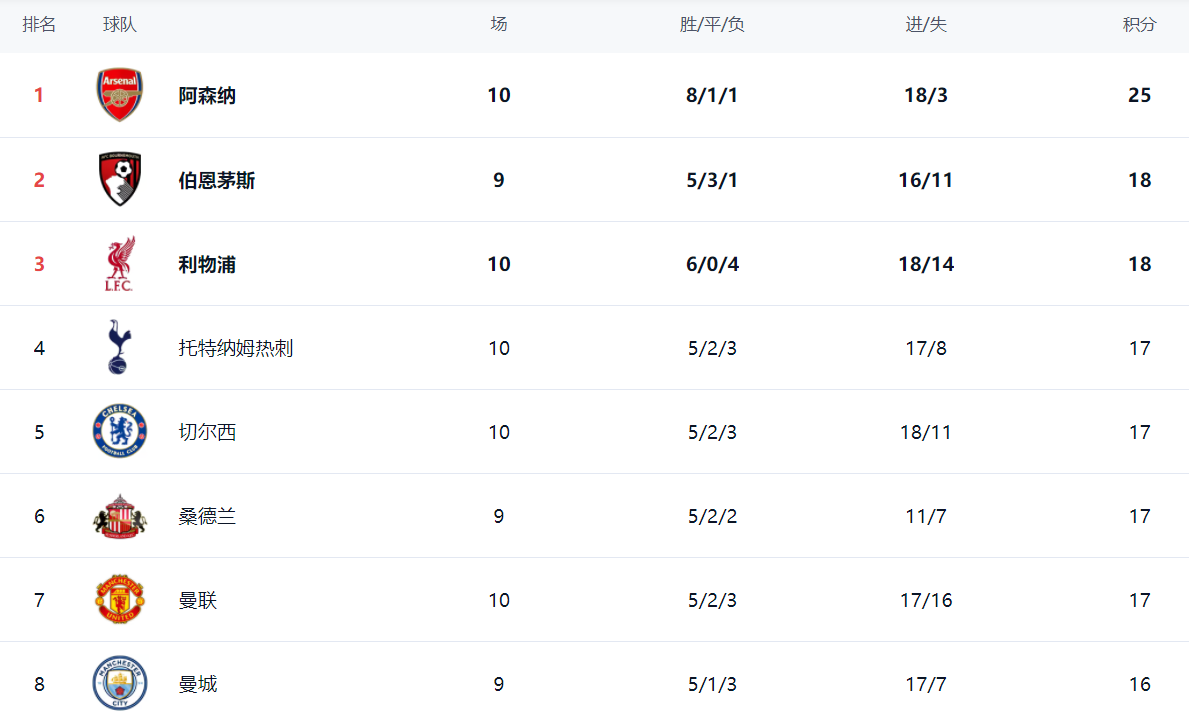 In the standings, Arsenal is the only one in the standings, ranking first with 25 points. Bournemouth, the dark horse, ranked second with 18 points. After Liverpool won, their total points reached 18 points and their ranking rose to third. The four teams Tottenham, Chelsea, Sunderland and Manchester United have the same points, 17 points each. Manchester City played 9 rounds and only scored 16 points, ranking 8th.