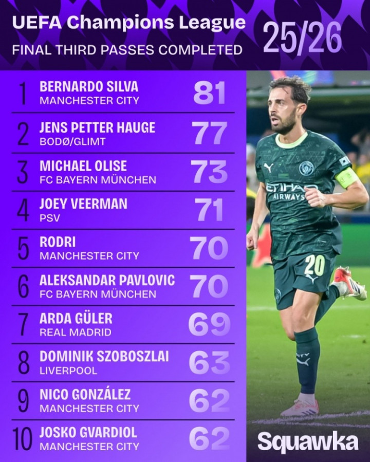 This season’s Champions League passing list in the attacking third: Seat B ranked first 81 times, with 4 players from Manchester City on the list