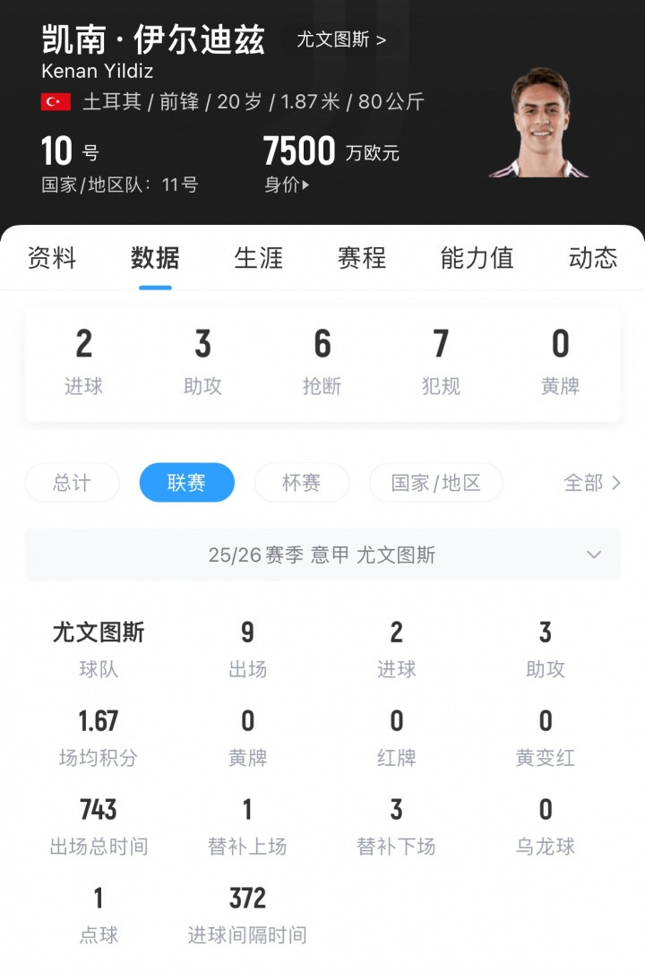Yildiz is 20 years old and plays as a left winger. The player's current transfer value is 75 million euros. The current contract with Juventus expires in 2029. This season, Yildiz has played 13 games for Juventus, contributing 3 goals and 4 assists.